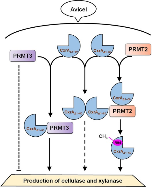 在《PLOS Genetics》研究成果中,转录因子CxrA是激活草酸青霉主要纤维素酶和木聚糖酶基因表达的调控因子。CxrA的调控功能依赖于第94位精氨酸(R)的甲基化。精氨酸甲基化转移酶PRMT2负责甲基化R94,且正向介调草酸青霉纤维素酶和木聚糖酶的产生。精氨酸甲基化转移酶PRMT3体外相互结合但不甲基化多肽CxrAΔ1-60,负向介调草酸青霉纤维素酶和木聚糖酶的产生,其对CxrA从细胞质进入细胞核起关键作用(图1)。
