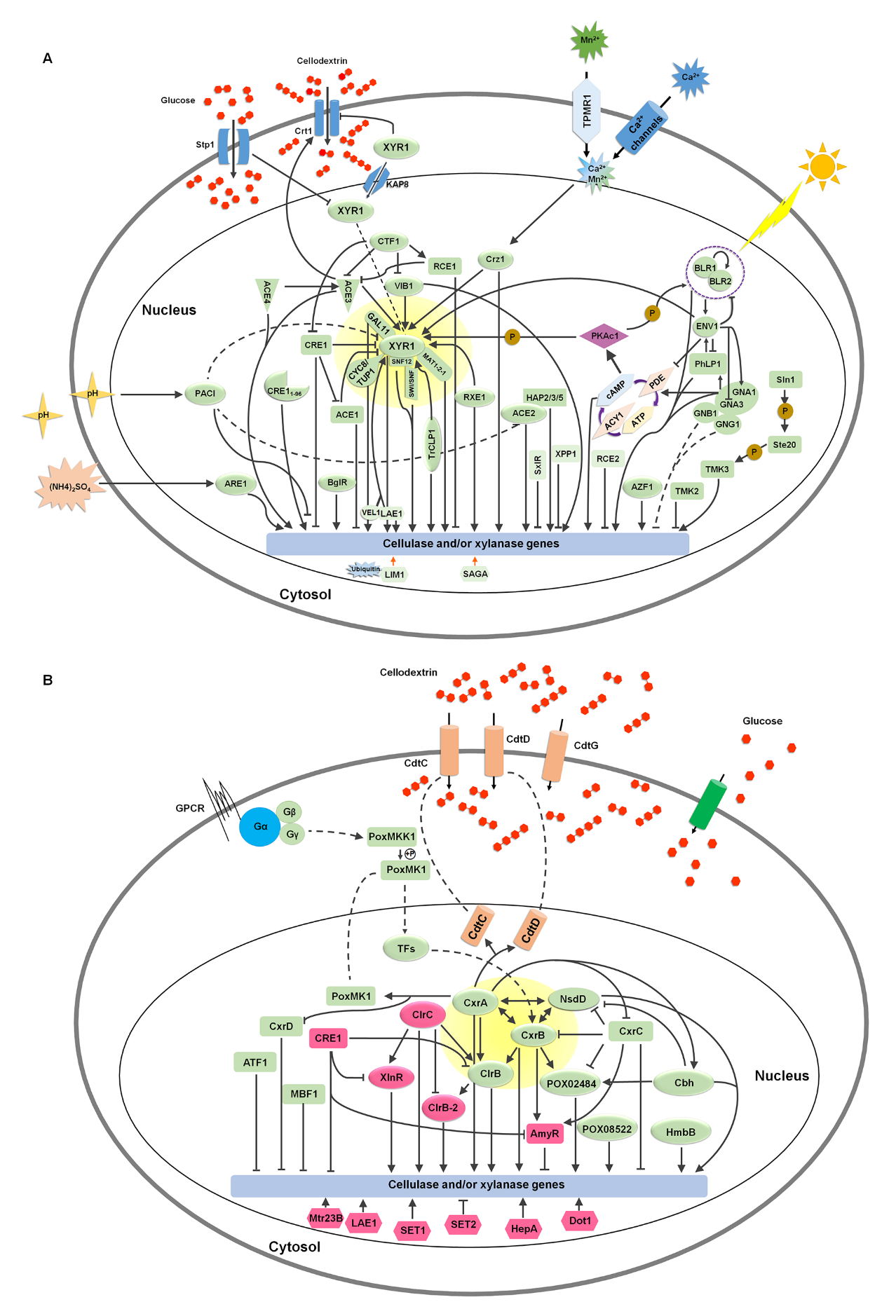 在《Critical Reviews in Biotechnology》论文中,从宿主特异性的角度全面归纳和总结了丝状真菌草酸青霉和里氏木霉中植物细胞壁降解酶生物合成的调控因子,绘制了植物细胞壁降解酶合成的调控网络(图3),并提出了建设性的评论观点以及将来的研究方向。