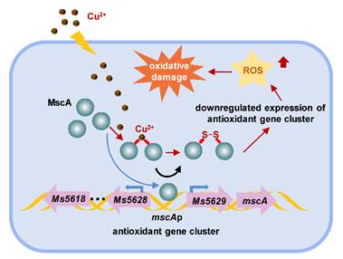 在这项研究中,研究团队首次报道了一个响应Cu2+的转录因子MscA调节细菌的抗氧化防御。Cu2+直接与MscA的半胱氨酸结合形成配位键作为过渡态,然后进一步氧化半胱氨酸形成二硫键,导致MscA寡聚化从而抑制其DNA结合活性。最终,Cu2+下调了抗氧化基因簇的表达,增加了ROS的积累,导致分枝杆菌的氧化损伤。这一发现首次直接将Cu2+的功能与细菌的抗氧化防御偶联,为细菌的逆境适应提供了新见解。