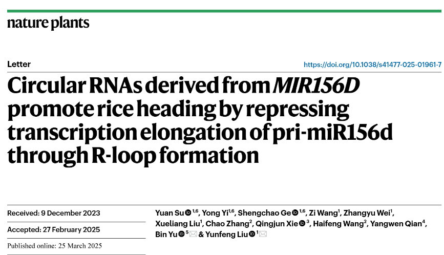 近日,我院刘云峰教授团队在环形RNA调控水稻开花领域取得新进展,相关研究成果以“The circularRNAs derived from MIR156D promote rice heading by repressing transcription elongation of pri-miR156d through R-loop formation”为题,发表在Nature子刊Nature Plants上。该论文的共同第一作者为太阳成tyc234cc苏元副教授、2021级生物学博士生易勇和葛盛超副教授,通讯作者为我院刘云峰教授和美国内布拉斯加大学林肯分校于彬教授。太阳集团tyc234cc为论文第一完成单位。