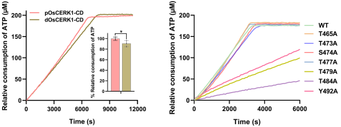 自磷酸化对于许多激酶的激活至关重要。研究人员发现OsCERK1通过分子间自磷酸化显著提高了其催化活性,并证实激活段中的磷酸化位点T479、T484和Y492对OsCERK1的催化活性和底物磷酸化至关重要。