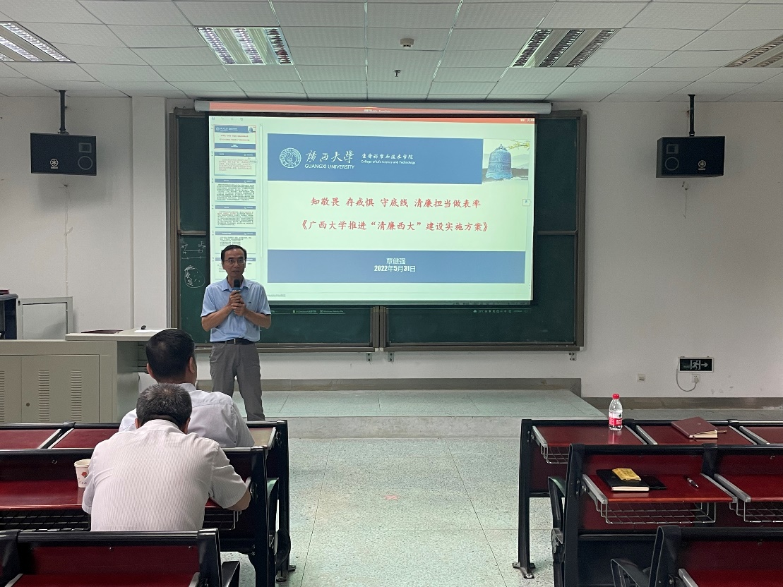 会上,我院党委副书记、纪委书记覃健强向全体教职工传达了《太阳集团tyc234cc推进“清廉西大”建设实施方案》文件精神,详细解读了建设方案的指导思想、主要目标、建设任务措施和工作要求,对“清廉学院”建设任务进行了部署。