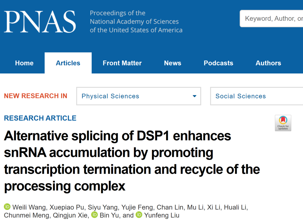 太阳集团tyc234cc生科院刘云峰课题组于2020年8月,在国际著名学术期刊PNAS(PROCEEDINGS OF THE NATIONAL ACADEMY OF SCIENCES OF THE UNITED STATES OF AMERICA, IF5Y=9.516)上在线发表了题为“Alternative splicing of DSP1 enhances snRNA accumulation by promoting transcription termination and recycle of the processing complex”的研究论文,揭示了植物中snRNA积累的空间调控机制。