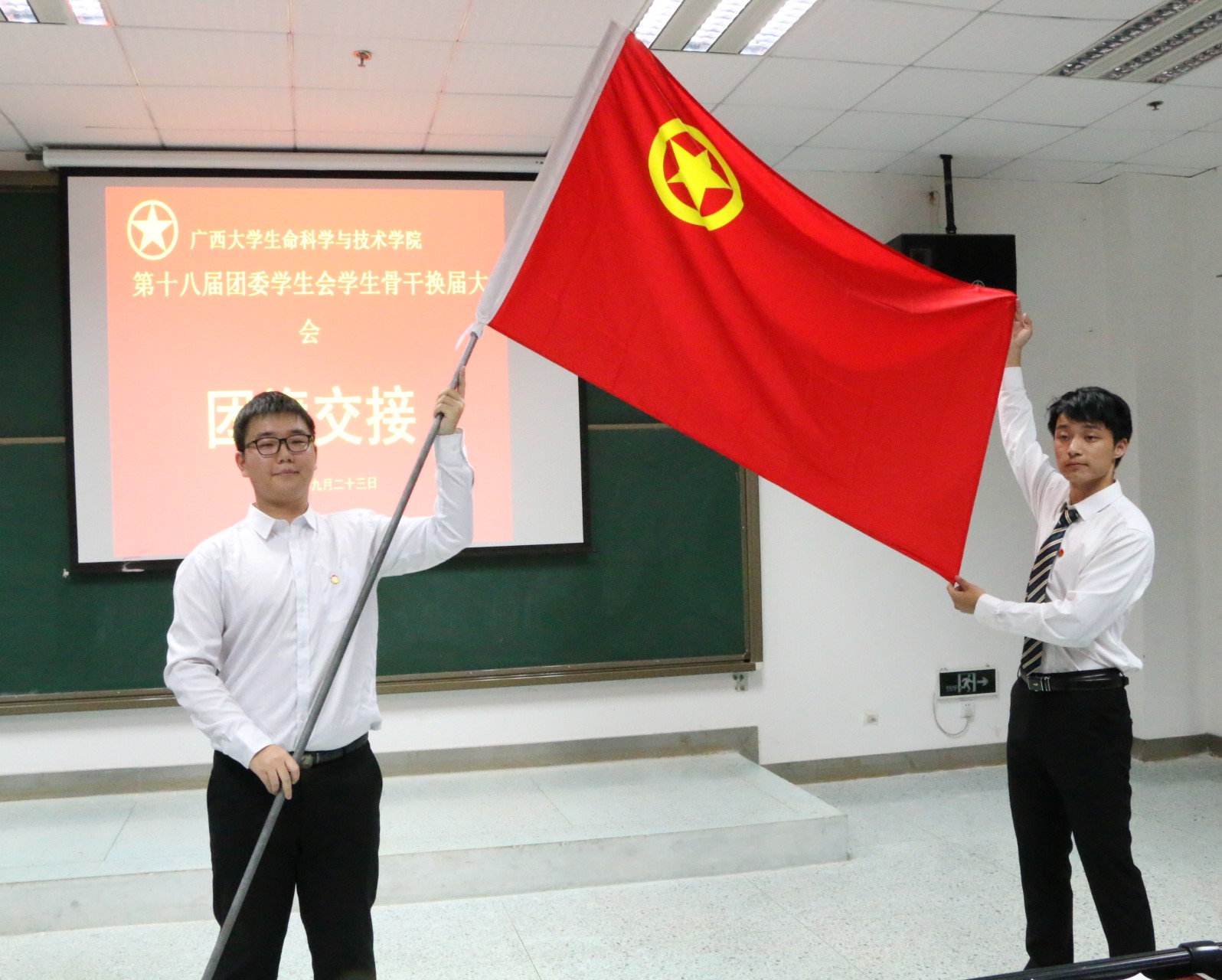 紧接着学院团委书记周嫱老师宣读了第十八届团委学生会骨干名单。随后是庄严的团旗交接仪式,上一任团委副书记叶泽阳将团旗递交给新一任团委副书记占昌义手中,标志着责任与使命的传递。